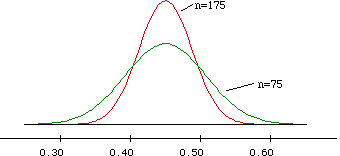 (a) normal distribution with mean .45 and standard deviation .0376; same shape and center but less spread out
